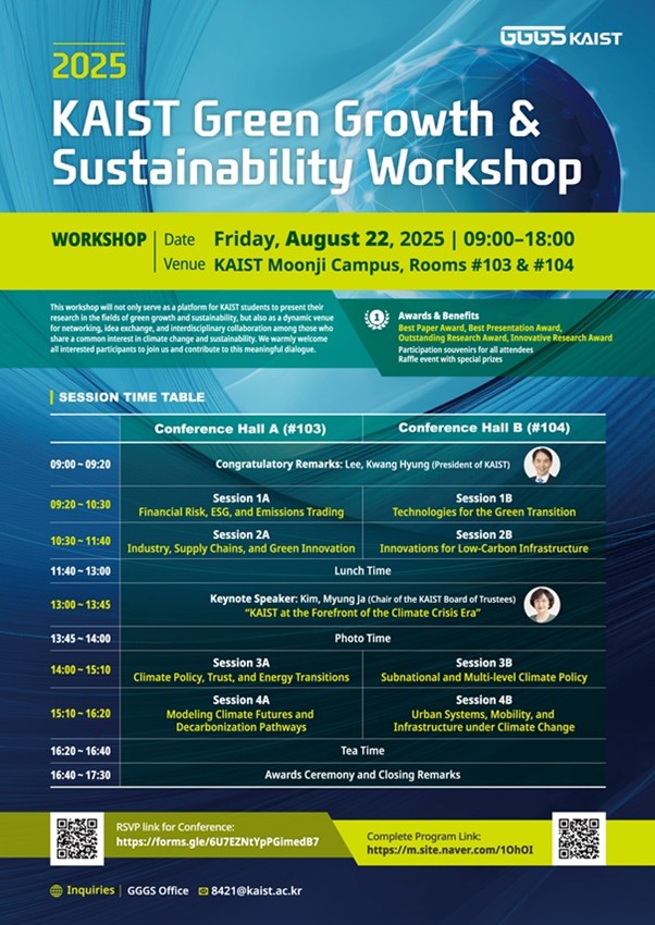 우리 대학은 8월 22일(금) 문지캠퍼스에서 「2025 KAIST Green Growth & Sustainability Workshop」을 성공적으로 개최했다고 밝혔다. KAIST 녹색성장지속가능대학원(GGGS)이 주관한 이번 워크숍은 KAIST 재학생들의 기후변화 대응 및 지속가능성 연구 성과를 공유하고, 탄소중립과 녹색성장을 지향하는 교내 다양한 학문 간 융합연구를 촉진하며, 학술교류를 활성화하기 위해 올해 처음으로 마련됐다.