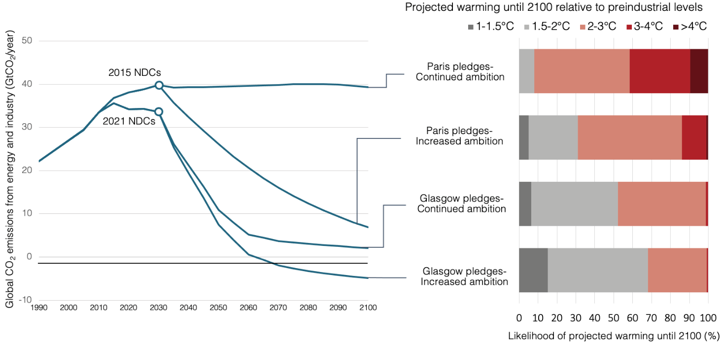 The initial NDCs submitted after the 2015 Paris Agreement fell short of the 2°C target, with a high risk of exceeding 3°C. COP26 showcased the Agreement’s ratcheting mechanism, resulting in updated NDCs and ambitious decarbonization pledges. If countries maintain a 2% decarbonization rate beyond 2030, there’s a >50% chance of limiting end-of-century warming to <2°C, rising to nearly 70% with a 5% rate. However, achieving the aspirational 1.5°C goal remains unlikely, necessitating further ambition. Even with enhanced ambition, global temperatures may temporarily exceed 1.5°C this century, making near-term collective ambition vital to limit temperature overshooting and incentivize R&D in technologies like carbon dioxide removal, accelerate fossil fuel phase-out, and engage the private sector for cost-effective long-term GHG reductions.